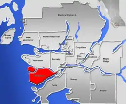 - ↑ Population calculated by adding the population of Richmond (198,303) and Queensborough, New Westminster (8,727) and removing the population of Sea Island (814)