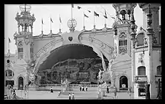 The arched entrance on Surf Avenue was described in The Street Railway magazine as "covering half of an entire city block",[228][229] with four monolithic figures, one at each of its corners.[30][31][229] The entrance gate contained five ticket kiosks, shaped like Roman chariots and staffed by "young women dressed in evening attire and Merry Widow straw hats emblazoned with red feathers".[230] A large avenue called the Court of Honor extended straight from the entrance and was surrounded by 53 buildings.[230] There was a replica of Venice to the right of the court,[31][228] which included a miniature Grand Canal with gondoliers, as well as a model of the Piazza San Marco.[230] To the left of the Court of Honor were three large buildings, which featured the Trip to the Moon, War of Worlds, and 20,000 Leagues Under the Sea attractions.[30][231] Other attractions, which housed various shows, the Grand Casino, and the Old Mill and Helter Skelter attractions, were placed alongside the Court of Honor.[38]