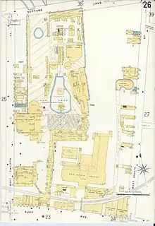 Thompson and Dundy agreed to take over the site of Paul Boyton's 16-acre (6.5 ha) Sea Lion Park in August 1902.[12][13] As part of the deal, they leased some land from Frederick Kister, and they also leased a strip of land on West 12th Street for 25 years.[14] Sea Lion Park had several centerpiece rides, but low attendance during the 1902 season and competition with Steeplechase Park had prompted Boyton to leave the amusement park business.[9] Thompson and Dundy also leased the adjacent site of the Elephantine Colossus Hotel,[9] which had burned down in 1896.[15] This gave them 22 acres (8.9 ha), all the land north of Surf Avenue and south of Neptune Avenue, between West 8th and West 12th Streets.[16]