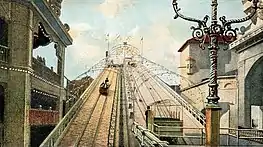 Thompson and Dundy planned to add new rides including a flower garden, a German village, and a Trip to the Moon attraction.[20] The lagoon and the Shoot the Chute attraction were the only parts of Sea Lion Park to be retained.[9][10][20] Early plans called for Luna Park to include a tower with 38,000 lights.[13] The park's original rides and attractions also included an infant incubator, a Shoot the Chute ride, a three-ring circus, and a Fire and Flames show that employed over a thousand performers.[25] Luna Park unofficially opened on April 5, 1903, with a live show.[26][27] The same month, Leo Wyent and George M. Foley sued to prevent Thompson and Dundy from issuing a concession allowing a third party to sell cigars and alcoholic beverages at the park.[28] Thompson and Dundy planned to sell alcoholic beverages at one location in the park, the German Village.[26]