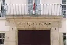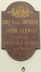 The buildings were originally part of the Hermitage, which then became the hôtel de Fourcy.[2] In 1827, the hotel was loaned to the Institution Petit, then in 1858 to the pension Harent boarding house which housed students from the lycée Charlemagne. In 1880, the locals opened a female primary school, the first in Paris, and the City of Paris bought the building in 1882. Starting with 65 students, the school had 425 in 1900. In 1888, the name of Sophie Germain was given to the school.