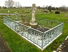 The funeral took place on Wednesday 16 October 1940 at St John's Church in Brunswick Square,[46] Herne Bay, Kent. The Reverend A.W. Parry Williams officiated in the church and at the committal by the graveside;[26] there was a surpliced choir at the church service, and the organ played I know that my Redeemer liveth from Handel's Messiah as the coffin was borne into the church. There were many mourners including the Sultan at the church and cemetery, and a large number of floral tributes. The Sultan's wreath was "laid in the grave with the coffin".[26][27] The interment was at Herne Bay Cemetery at Eddington.[45] In plot BBR46 at the eastern edge of the cemetery is an elaborate, marble monument to her; it is blue and white like her house. It was paid for by the Sultan and adorned with a standing Saxon-style cross, a marble floor with an engraved poem and an iron fence.[26] The inscription says:
