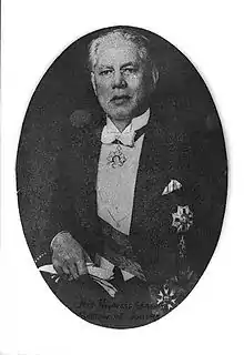 Cissie was the Sultan's favourite until she died, and he said he was heartbroken.[37][43] Then, six days later he met a Romanian girl Marcella Mendl aged 25 who was selling Red Cross flags in London, and it was "love at first sight".[37][43] He courted her for twelve days and during this time he was visiting Cissie's parents to give his condolences – and perhaps to retrieve some jewellery that he had given to Cissie.[43] On 6 November 1940, less than a month after Cissie's death, the Sultan married Miss Mendl at Caxton Hall register office in London; the bride was wearing "a diamond brooch in which the Crown of Johore was flanked by the Sultan's crest, two tiger claws".[43] Cissie's parents said that it had come as a great shock to them.[43][51] By 10 November 1940, the Sultan was telling the Sunday Pictorial: "I prefer to forget the past. It is for the future I want to live."[36]
