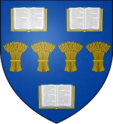 Azure between three books Argent bound Or four garbs in fess also Or.