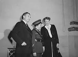 In 1942, Pavlichenko was sent to Canada and the United States for a publicity visit as part of the Soviet Union's attempts to convince the other Allies of World War II to open a second front against Nazi Germany.[6] When she visited the United States, she became the first Soviet citizen to be received by a US president, as Franklin D. Roosevelt welcomed her to the White House.[8] Pavlichenko was later invited by First Lady Eleanor Roosevelt to tour the US, relating her experiences as a female soldier on the front lines.[8] During the publicity tour, Pavlichenko was not taken seriously by the press and was referred to as the "Girl Sniper."[5] Not cut out to be a diplomat, she was shy and said she just wanted to kill fascists.[15] When meeting with reporters in Washington, D.C., she was dumbfounded by the kind of questions put to her. "One reporter even criticized the length of the skirt of my uniform, saying that in America women wear shorter skirts and besides my uniform made me look fat."[16][17] They also asked if she used makeup on the front line.[8] She challenged an especially sexist reporter to a fistfight. She responded to a question about her underwear so: