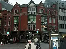 The corner structure is a four-storey, vaguely of the Arts and Crafts Movement, red-brick and early twentieth century, with Tudor-style projecting bay windows. There is a decorated iron three-dials clock on the Suffolk Street frontage. The building is protected and in a conservation area.