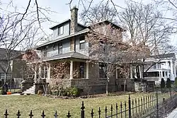 The M.J. Marks House in Boise, Idaho, is a 2+12-story Colonial Revival house with "bungaloid features" designed by Tourtellotte & Hummel and constructed in 1911. The house includes random course sandstone veneer on first-story walls with flared second-story walls veneered with square shingles under a low pitch hip roof. Room sized porches are a prominent feature of the design.[2]