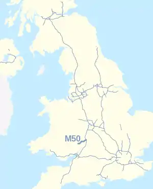 The M50 is a motorway in Worcestershire, Gloucestershire, and Herefordshire, England. Sometimes referred to as the Ross Spur, it is a 22 miles (35 km) connection of the M5 motorway M42 Motorway to a point near Ross-on-Wye, where it joins the A40 road continuing westward into Wales. The motorway was fully opened in 1962.