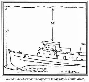 The wreck of the Gwendoline Steers lies in 38 feet of water at the mouth of Huntington Bay, NY between Eaton's Neck and Lloyd Neck on the north shore of Long Island. The distance is 20 feet from the top of the pilot house to the surface of the water at mean low water. A significant amount of hardware has been stripped from the vessel by recreational divers, but the structure of the vessel remains in excellent condition, however visibility at the wreck is lower than surrounding Long Island Sound wrecks. The wreck appears in a number of books detailing Long Island dive sites.