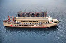She has a generation capacity of 114 MW on dual-fuel (HFO- and gas-fired). In October 2011, the Powership sailed to Basra, Iraq, where she supplied electricity for about one million residents there in a timespan of three years.[5] Two vessels of the fleet, MV Karadeniz Powership Doğan Bey (126 MW) and MV Karadeniz Powership Rauf Bey (180 MW),[6] were already stationed in Iraq to bridge power shortage.[7]
