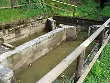 Next to the Bierstollen stands a model of a wooden pit support system, which is part of the Lautenthal Mining Education Path (Lautenthaler Bergbaulehrpfad).