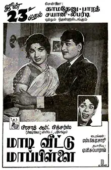 Maadi Veettu Mappillai (transl.The Son-in-Law who stays on the top floor) is a 1967 Indian Tamil-language comedy film, directed by S. K. A. Chari. A remake of the Telugu film Illarikam (1959),[3] it stars Ravichandran and Jayalalithaa, with Nagesh, Rama Prabha, V. K. Ramasamy, Balaji, Major Sundarrajan, T. S. Muthaiah, Udaya Chandrika and P. K. Saraswathy in supporting roles. The film was released on 23 June 1967.