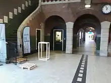 Due to the fortified character of the town, the first railway station was in fact situated outside Maastricht, within the municipality of Meerssen. The first station was built out of wood, so that in case of attack it could quickly be demolished. The municipal borders were adjusted in 1907, making the station part of the municipality of Maastricht. The current brick building was built in 1913, designed by George Willem van Heukelom. Due to its international connection, the station housed border customs. Even though Belgian trains from Liège still terminate at Maastricht, passport and security checks have gone with the implementation of the Schengen Agreement. The former customs space is now used for small shops such as a florist, an Albert Heijn, a HEMA and snackbars.