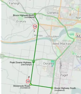 Stage 1 is 11.34 km in length and connects the Bruce Highway to the south of Mackay (at Stockroute Road) with the Bruce Highway to the north of Mackay (near Bald Hill Road). It includes a new bridge over the Pioneer River and an interchange with the Peak Downs Highway. It provides a bypass of Mackay for Bruce Highway traffic that is immune to flooding and free of signalised intersections.[1] Stage 1 of the project was expected to cost $540 million, 80% of the funding was from the Commonwealth and the remaining 20% from Queensland.[2]