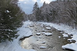 After winding through the Waterville Valley Resort community, the Mad River proceeds southwest over continuous boulder-strewn rapids into a corner of the town of Thornton, eventually settling out in Campton Pond in the town of Campton.[2] Passing over a small hydroelectric dam at Campton Upper Village, the river descends over some small waterfalls and enters the floodplain of the Pemigewasset River, which it joins near Interstate 93.