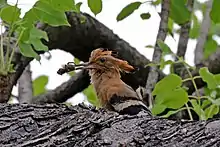 The adult Madagascar hoopoe is about 32 cm (12.6 in) long and weighs 57 to 91 g (2.0 to 3.2 oz). It has a long, decurved bill, and cinnamon-coloured plumage, the wings being boldly barred in black and white. The tail is black and a long, cinnamon crest with black-tipped feathers can be raised when the bird is alarmed. The wings are broad and rounded; the characteristic flight consists of a few beats after which the wings are folded momentarily and the bird glides, before resuming flapping. The female is slightly duller in colour than the male, with less white on the wings.[3][4] Compared to the African hoopoe, it is larger, has a longer tail and a pinker throat. The song differs markedly from the African hoopoe's "hoop-hoop-hoop", being described as "a low cooing trill rrrrrrooow, dropping slightly, lasting 1.5–2.5 seconds, repeated every 3–10 seconds".[3]