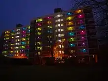As well as the many projects commissioned from professional artists, the whole City of Culture year supported sixty community projects encouraging local people and groups to develop their own events and work.[24] During the first season one of the most dramatic was an installation called I wish to communicate with you which simply placed coloured filters into the lights of blocks of flats, transforming them into a large scale light installation.[25]