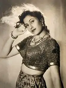 Madhubala (1933–1969) was an Indian actress and producer who appeared in 73 Hindi-language films in a career spanning from early 1940s to mid-1960s.[2] She made her debut at age 9 playing an uncredited role in the romantic musical Basant (1942).[3][4] In 1944, she signed a contract with Ranjit Movietone, under which she featured in minor roles for the next two years.[4][5] The contract ended in 1947, prompting director Kidar Sharma to cast Madhubala as the leading lady in the drama Neel Kamal (1947).[4] Although a commercial failure, the film garnered her critical praise,[6] and she subsequently rose to prominence after playing key characters in the drama Lal Dupatta (1948) and the horror film Mahal (1949).[4][7] For a brief period, Madhubala continued starring in a number of successful productions, including the romantic musical Dulari (1949), the dramas Beqasoor (1950) and Sangdil (1952), and the romances Badal (1951) and Tarana (1951), frequently collaborating with actors such as Dev Anand, Dilip Kumar and Prem Nath.[8][9]