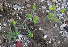 Madia exigua is an aromatic annual herb growing up to half a meter (20") tall, its slender stem coated with hairs, large stalked resin glands, and sometimes bristles. The rough-haired leaves are 1 to 4 centimeters (0.4 to 1.6") long.