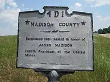 Madison County was formed in 1821, and named for founding father and president, James Madison. The county was part of lands the United States purchased from the Chickasaw in 1818.[4] After Congressional passage of the Indian Removal Act of 1830, most Chickasaw were forced out of the state and west to Indian Territory beyond the Mississippi River.