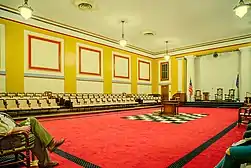 It is a three-story building with four colossal columns in its front facade, with its three main entrances set back from them. It is 112 by 182 feet (34 m × 55 m) in plan and has a large, 1200-plus seat auditorium in its rear section.[3]
