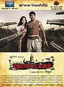 Madrasapattinam (transl. Madras Town) is a 2010 Indian Tamil-language historical romantic drama film written and directed by A. L. Vijay. The film stars Arya with Amy Jackson, (in her feature film debut), while Carole Trangmar-Palmer played older version of Amy. [1] In addition to Nassar, Cochin Hanifa, Lisa Lazarus, Alexx O'Nell and others play supporting roles.[2] The music was composed by G. V. Prakash Kumar with editing by Anthony and cinematography by Nirav Shah. The film was released on 9 July 2010 and became a box office success.[3]