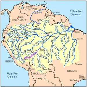 The Madre de Dios River (Spanish pronunciation: [ˈmaðɾe ðe ðjos]) is a river shared by Bolivia and Peru which is homonymous to the Peruvian region it runs through. On Bolivian territory, it receives the Beni River, close to the town of Riberalta, which later joins with the Mamore River to become the Madeira River after the confluence. The Madeira is a tributary to the Amazon River.