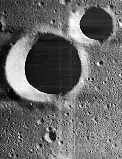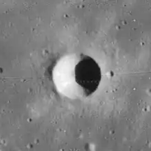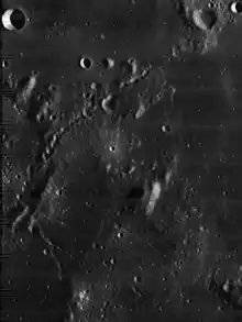 Maestlin is a small, bowl-shaped impact crater located near the eastern edge of the lunar Oceanus Procellarum. It was named after German mathematician Michael Maestlin.[1] To the east lies the crater Encke and to the northeast is Kepler. Just to the southeast of Maestlin is the curved, ridge-like remains of Maestlin R, a walled plain that has been almost completed submerged by the mare. South of this feature is a system of linear rilles named Rimae Maestlin. The mare surface around Maestlin is dusted with ray material from Kepler.