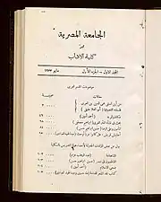 The Egyptian journal Maǧallat Kullīyat al-Ādāb bi-l-Ǧāmiʿa al-Miṣrīya (Arabic: مجلة كلية الآداب بالجامعة المصرية; DMG: Maǧallat Kullīyat al-Ādāb bi-l-Ǧāmiʿa al-Miṣrīya; English: "Bulletin of the Faculty of Arts of the University of Egypt") was published at Cairo University, formerly known as the University of Egypt resp. later known as Fuad I University, between 1933 and 1942. A total of ten issues was published in six editions every six months.[1]
