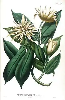 Illustration, lithographed, hand-coloured of Aromadendron elegans Blume, the type species of genus Aromadendron. Plate VII in C.L. Blume, Flora Javae, pars 19-20 Magnoliaceae (1829)