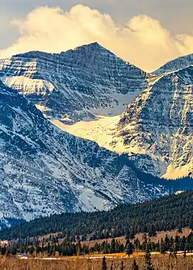Mahtotopa Mountain (8,677 feet (2,645 m)) is located in the Lewis Range, Glacier National Park in the U.S. state of Montana.[3] Mahtotopa Mountain rises to the south above Saint Mary Lake midway between Red Eagle Mountain and Little Chief Mountain and can be easily seen from the Going-to-the-Sun Road to the southwest of Rising Sun. Originally named Four Bears Mountain by George Bird Grinnell in 1885, the name was changed in 1932 to Mahtotopa. Mahtotopa is an incorrect spelling of "Mato-tope", the Mandan chief known as Four Bears. Mato-tope was a grandfather of Joe Kipp, a hunting companion of Grinnell.