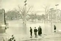 In 1903, six years before his death at the age of 76, Joseph Edward Merrill donated the funds to build a new library, while George W. Hammond donated the land from his Forest Paper Company.[29] The architect was Alexander Longfellow, a nephew of the poet Henry Wadsworth Longfellow. Also involved in the library's construction was John Coombs, father of George and Albert. Despite the occasional flood, town offices were eventually established in the library's basement.[30] The flooding was partly caused by the blockage of Cleaves Brook (to the left of the town hall) — which formerly drained the whole center of town — when Brickyard Hollow was filled in.