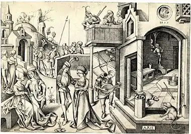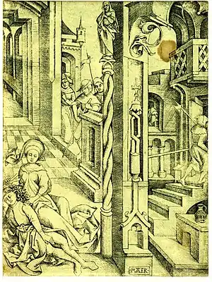Mair favours complicated and "fantastic architectural spaces, with walls joining at the most unlikely angles. The scenes resemble whimsical stage sets, and are endowed with an unreal character, like something from a fairy tale."[14] Apart from conventional religious scenes, which often also have the fanciful architectural settings, there are engravings of couples and some unusual and original images, combining glamorous figures with a moralizing theme. His Annunciation, surviving in a unique impression in Washington, "is remarkable for its ambitious but confused perspective, apparently the result of a desire to reference a number of rather complex theological issues". The composition attempts to combine the architecture of a church with that of a bedroom, and "the foreground of the composition is further complicated by several ill-foreshortened sets of steps that distort the bed-altar area, giving it the elevation of a shrine." Its "spatial clumsiness" has suggested it is his earliest print.[15]