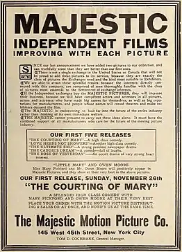 Mary Pickford was one of its actresses.[3] She left for Biograph in 1912.[4] Donald Crisp directed several Majestic films.