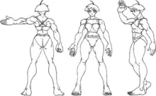 Makoto stands 160 cm tall (5 ft 2 in) and has measurements of 80-61-87 cm (32-24-34 in).[10] During development many designs were proposed with a guideline to include a loose fitting karate gi though the amount of the outfit sometimes varied drastically from one design to the next.[6] The gi was intended to be the oversized and loose fitting on her due to it being her deceased father's.[7] According to the book All About Capcom Fighting Games 1987-2000, due to her behavior and attire she is commonly confused by players to be "Ryu's little sister".[11] Her finalized design consists of a barefoot muscular woman with short black hair wearing a white loose gi, a red halter top underneath her gi resting at her cleavage, a long flowing yellow ribbon around her neck.[9] The ribbon in particular was added by 3rd Strike's development team to demonstrate her speed and trajectory, as well as telegraph to the opponent certain moves Makoto performs.[12]