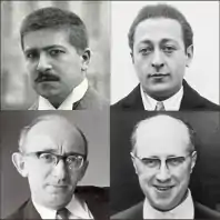 Four of the many soloists who recorded concertos with Sargent: Artur Schnabel (top l.), Jascha Heifetz (top r.), Clifford Curzon (lower l.) and Mstislav Rostropovich.