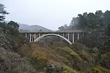 Malpaso Creek Bridge (No. 44-17)[24][25] was built at a cost of $24,000 in 1935 using a reinforced concrete open-spandrel arch design, similar to the famous Bixby Creek Bridge, located 8 miles (13 km) to the south.[26] It is 210 feet (64 m) long and 24 feet (7.3 m) wide.[27]