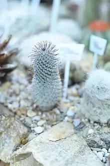 Mammillaria perezdelarosae is a cactus – a member of the family Cactaceae, placed in the tribe Cacteae. This cactus is common. It blooms with light pink and white flowers and is native to Jalisco, Mexico.