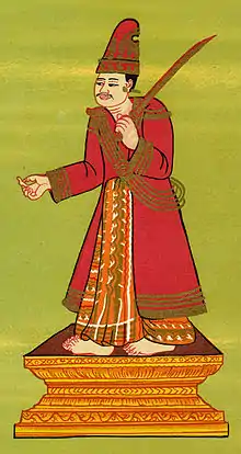 Mandalay Bodaw (Burmese: မန္တလေးဘိုးတော်, pronounced [màɰ̃dəlé bódɔ̀]; lit. 'Lord Grandfather of Mandalay') is one of the 37 nats in the official pantheon of Burmese nats. The son of King Pallikara, possibly of the Pala dynasty of Bengal and brother of Shingwa, one of the 37 nats.[1] He was Ponna descent who had tended, taught and looked after Shwe Hpyin Nyi Naung brothers is their boyhood. During King Anawrahta’s reign he became a minister. In fact Shwe Hpyin Nyidaw and Shwe Hpyin Naungdaw being fatally punished happened to be primarily due to the fact that the guardian minister's way of teaching, tending and upbringing were merely wrong and defective for which he was fully responsible, teaching false lesson is a punishable offence. Getting wind of taking action against him the old man Bo Daw tried to run away with his elephant was caught red-handed just before absconding. The penalty inflicted on him was death, thus immediately after execution he became a Nat of Mandalay Bodaw.[2][3] He is portrayed standing on a pedestal with a sword on his shoulder and a hand raised, pointing his finger.[3]