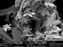 ![]() Electron micrograph of MnSi2 stars grown on Si plates | |