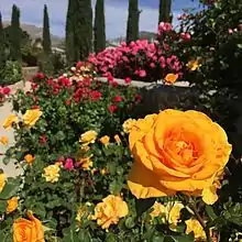 Another park in the area is the Municipal Rose Garden, which was opened in May 1959.[13] The rose garden showcases over 430 varieties of roses and 1,500 individual rose buses.[14] The roses growing in the garden are representative of types that grow best in El Paso's desert climate.[15] The garden is about 4-acres in size.[15] The garden has been maintained by El Paso Master Gardeners since 2007, who work as volunteers.[14] The garden is multi-level and also includes waterfalls and a koi pond.[15] The garden is open seasonally, from the beginning of March until the end of November.[14] It is located on North Copia street and has free admission.[16] Prior to the Rose garden, there were several different gardens on the site which were known as the Hill Top Gardens Area and opened in 1933.[13] The rock wall seats of the garden were part of a Civil Works Administration project and the gardens were completed by 1935.[13] The Hill Top Gardens won a Better Homes and Gardens contest in 1938.[13]