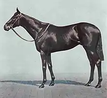 Manna, described by the Breeders’ Review as "a superb creature" with whom it was "impossible to find fault",[1] was a bay horse bred in Ireland by James J. Maher at his Confey Stud in County Kildare. As a yearling he was sent to the sales at Doncaster, where he was sold for 6,300 gns to the trainer Fred Darling acting on behalf of the Shanghai-based bullion broker Henry E. Morriss. Darling had been instructed by a telegram from Morriss to buy the best yearling in the sale.[2] Manna was trained by Darling at his stable at Beckhampton in Wiltshire[3] where he proved to be a lively and high-spirited individual.[4]