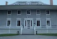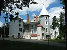 Built by Louis-Joseph Papineau between 1848 and 1850, the Manoir Papineau occupies a prominent spot overlooking the Ottawa River at Montebello, Quebec, Canada.[1] The building's architecture, according to Parks Canada, “represents a blend of stylistic influences similar in many respects to that which is encountered in contemporaneous neoclassical villas. Its sculpted decor recalls the Greek Revival style. From the river, the house appears as a monumental elevation flanked by two corner towers. The facade and hip slopes of the roof present an overhang of unusual proportions, in a muted reference to the Regency style. The conic roof atop the stair tower built following a fire in 1892 is representative of the Queen Anne Revival. Finally, interior door openings between adjoining rooms were aligned to create particular interior perspectives, in keeping with French architectural tradition. The spiral staircase located in one of the towers also shows the influence of this tradition. The unusual positioning of the main reception rooms to the back of the ground floor, combined with the abundant fenestration on the lower two levels of the east tower, recall that a conservatory was once located here.” The interior of the Manor House is splendid, and is furnished with its original décor. Guided tours include the dining room; the grand salon (yellow room); the blue room; the bedroom of Louis-Joseph Papineau; and the seigneur's office and library tower.