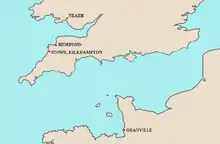 Historic seats of the Grenville family (spelled "Granville" after 1661[11]) in Normandy (Granville, Manche), Glamorgan (Neath Castle), Devon (Bideford) & Cornwall (Stowe, Kilkhampton)
