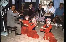 In the late 60s, during the Cultural Revolution, Mao's cult of personality reached new heights, with citizens performing a "Loyalty Dance" (忠字舞; zhōngzì wǔ) to express their love to the chairman.[47] This simple dance did not involve much more than stretching one's arms from the heart to Mao's portrait, with movements originating from a folk dance popular in Xinjiang. It was frequently accompanied by revolutionary songs including "Beloved Chairman Mao", "Golden Hill of Beijing" or "Sailing the Seas Depends on the Helmsman". Some lyrics included the quote "No matter how close our parents are to us, they are not as close as our relationship with Mao", which was used to inspire a spirit of collective worship.[48] A notable slogan related to the Loyalty Dance was the "Three Loyalties" (三忠于): loyalty to Chairman Mao; loyalty to Mao Zedong Thought; loyalty to Chairman Mao's revolutionary line.[49] The loyalty dance (忠字舞; zhōngzì wǔ) was an everyday fixture of life in the late 1960s, which was practiced in order to display one's lifelong devotion to Mao Zedong and exercise total discipline.[50] Nevertheless, by the 70's it was fleeting, and as the cultural revolution came to an end it rapidly waned.[48]