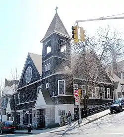 Saint Stephen's United Methodist Church, a community fixture since its 1898 construction, is located at 228th Street and Marble Hill Avenue.[22] It is the third structure of the same name, as well as one of the oldest remaining buildings in Marble Hill. The congregation was founded on Mosholu Parkway in 1826 and was incorporated a decade later, making it one of the earliest religious institutions in the area. It moved to another structure in Riverdale in 1876.[23] The church building was restored in the 1950s, and again in 2010.[22] One of its corners, the one closest to the intersection, has a tall bell tower. There are circular stained glass windows facing both streets. Inside is an Akron Plan-inspired setup with balconies and an auditorium that is laid out like an amphitheater.[22] One of the pastors of St. Stephen's was Reverend William Tieck, who served the church from 1946 to 1977. Tieck was the official Bronx County historian from 1989 to 1996, authoring several books about the Bronx.[12][24]