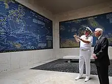 In the 1950s Bruton sisters worked for 3 years on approx. 22 mosaics and terrazzo maps for the memorial at the Manila American Cemetery.[11][9] The maps, were created using information from the American Battle Monuments Commission, were produced by the P. Grassi American Terrazzo Company in South San Francisco. Made from tinted concrete with vibrant colored aggregates, they incorporate military data through mosaic or ceramic details. The borders and compass designs reference Pacific Islands' art styles, and accompanying descriptive texts, made of plastic, elaborate on the maps' details.[12] The Margaret Bruton Collection, housed in the Mayo Hayes O'Donnell Library Doud House Archive Storage in Monterey, contains photo prints of 27 of these maps.[13] There maps were on display in the gallery of the New Monterey Neighborhood Center in 1966; this exhibition which offered a unique collection of photographic reproductions and original works in a variety of media by the Brutons. [14]