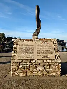 She created a Monterey Harbour plaque with the characteristic signature MB. The marker is located to the east of the entrance to the Fisherman's Wharf.