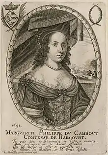 In 1634 she was married to Antoine de l'Age (1605–35), Duke of Aiguilon, also called Duke of Pui-Laurent. In February 1639 she married Henri de Lorraine (1601–66), Count of Harcourt, Grand Écuyer de France.4.[3] They had six children. Marguerite du Cambout died of apoplexy in Paris on 9 December 1674 at the age of 50.[5] She was buried in the Eglise des Capucines on the Rue Saint-Honoré, Paris.[1] Her half length portrait by Balthazar Moncornet (1598-1668), dated 1658, is held by the British Museum. In an oval border, it shows her upper body in an elaborate dress adorned with pearls and jewels, with a hunting scene in the background. There are four lines of verse below the portrait,[6]