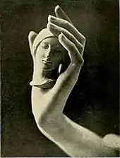 "Elegant, though sharply ironic":[14] "Head and Hand" photographic portrait of Agniel by Margaret Watkins, 1925, including portrait sculpture head by Jo Davidson[14]